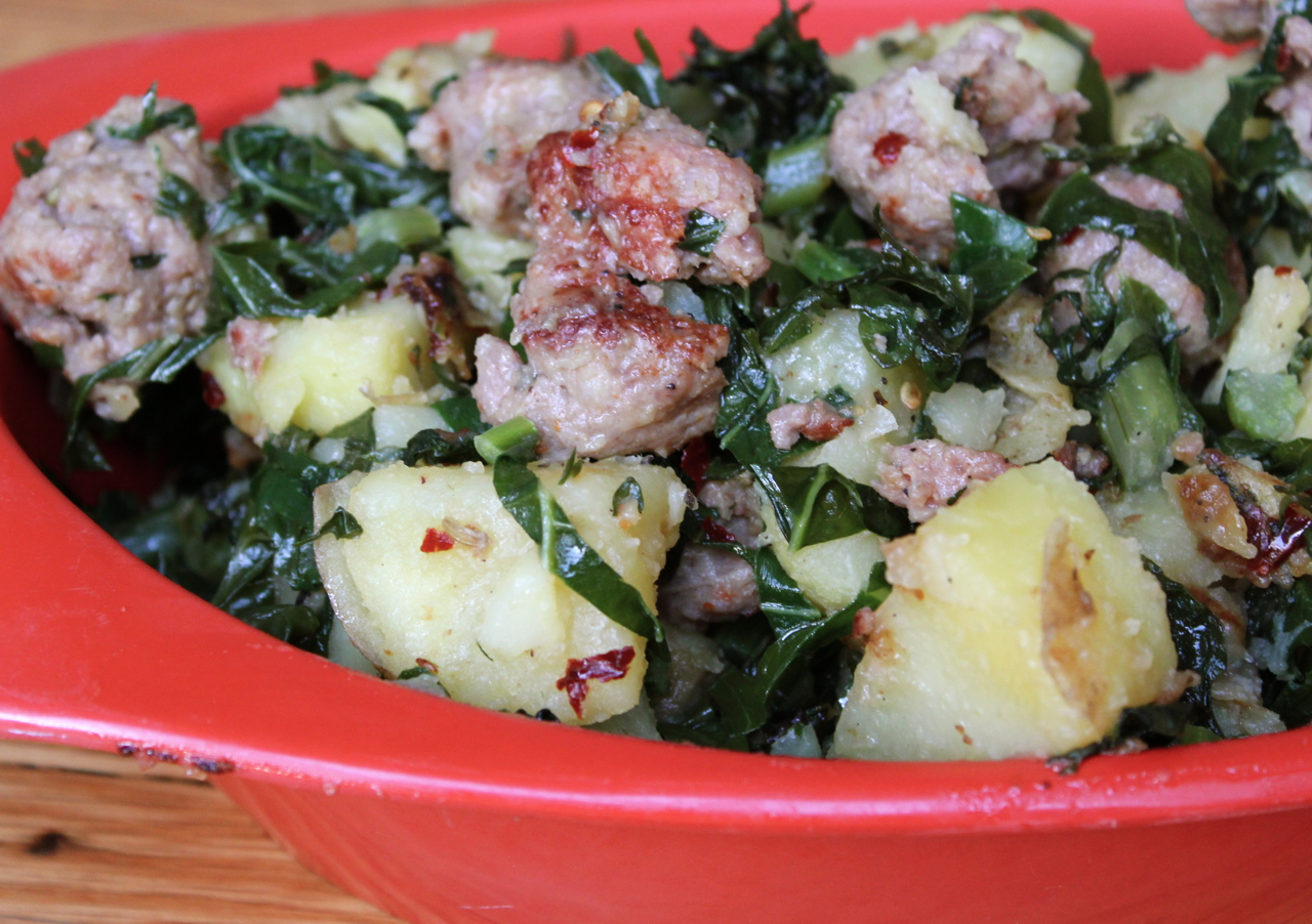 In a large, covered pot fry the sausage in the olive oil for a couple minutes. Add the onion and potatoes. Saute for 4 – 5 minutes, then add about 1/3 cup water. Keep the heat high, cover the pot, and let it cook for about 5 minutes. Uncover, stir the contents around and then pile the kale on top. If it doesn’t all fit at once, just cover the pot to let it wilt, then add the rest of the kale. Your goal is to have the potatoes cooked through, with a nice brown crust on the bottom of the pan, but not to let them burn. Total cooking time will be around 20 minutes, but much depends on your pan, and the heat output of your burner. You can always add a little water mid way through the cooking if it’s looking too dry. If there’s too much moisture, keep the lid off and let it evaporate. Season with salt and pepper, adding red pepper flakes to taste if you like it a little spicy.
