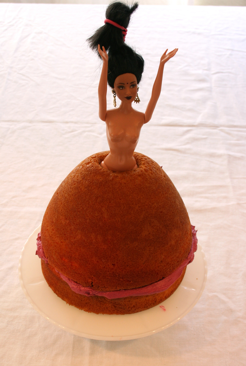 And then the magic starts.  Plunge the naked Barbie feet first into the cake.  Hands up, Barbie!  I put her hair up to keep it clear of the cake while I’m frosting the bodice.  Here’s the cake, with Barbie: