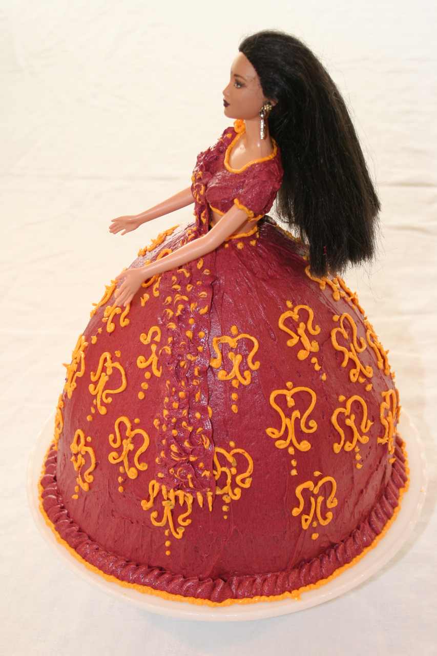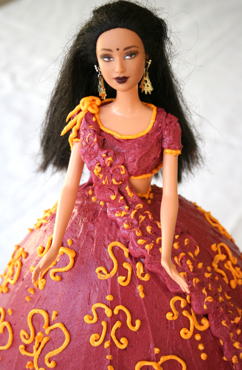 5.  Now the fun begins.  Using you favorite buttercream frosting, food coloring (use paste color), pastry bags and tips, go to town creating Barbie’s dress to your liking.  This cake used an Indian Princess Barbie, so her gown is loosely based on a sari.  I used two tips for this decorating, a ruffle tip and a small round tip.   Here is the finished Barbie cake:
