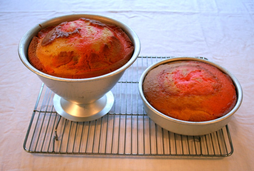 3.  Bake the cakes at 325.  8-inch round will be ready in about 35 minutes, the Wonder mold in about 45 – 50 minutes.  When a toothpick inserted in the middle of the cake comes out clean, the cake is ready.  Here are the baked cakes: