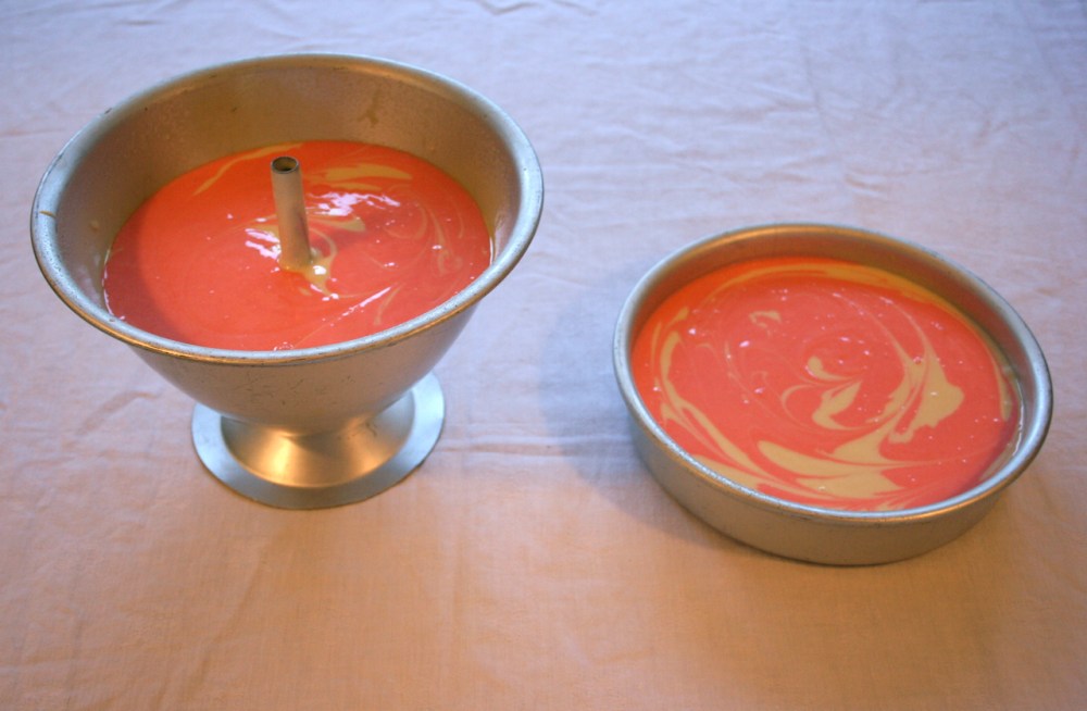 2.  Fill the pans with both cake mixes.  The Wonder mold takes one entire cake mix, but I add extra and put the remainder in the 8 inch pan.  Basically I add more batter to each pan than I normally would, but that’s because I want to have two level layers that are tall enough.  Here are the pans filled with batter, before baking.  This is a marbleized batter make with strawberry and vanilla mixes: