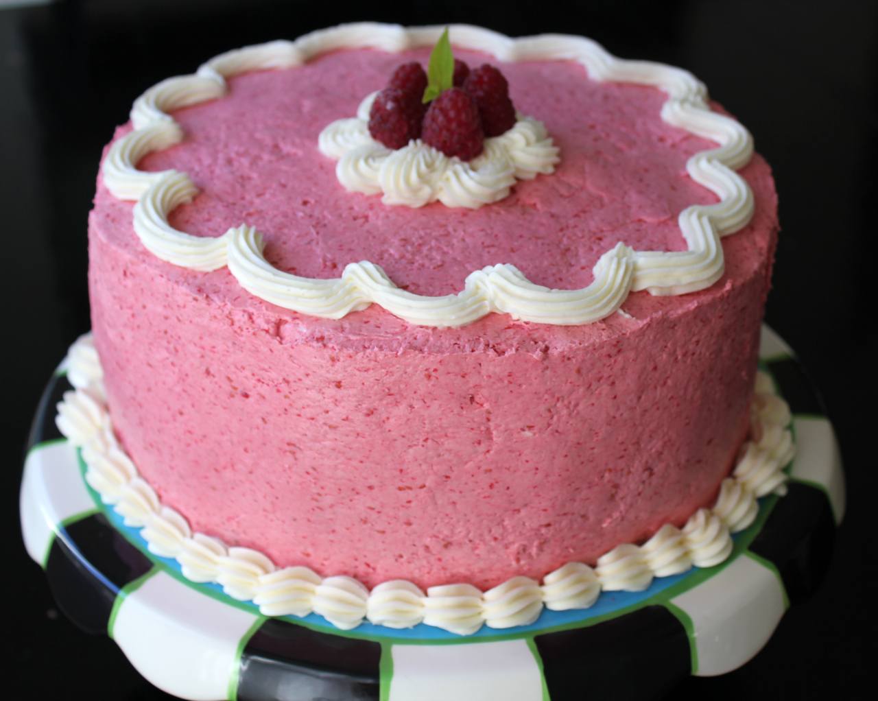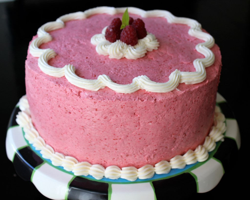 Assembly: Place one cake layer on a cake plate or pedestal stand. Spread some of the raspberry buttercream on the bottom cake layer. Dot with remaining whole raspberries. Place second layer on top. Frost with remaining raspberry buttercream. Decorate with reserved white buttercream, and whole raspberries, if desired.