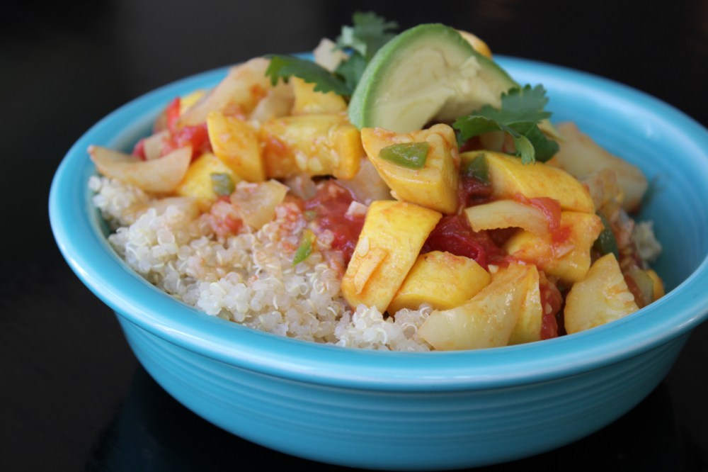 While the quinoa is simmering, heat a large frying pan over medium high heat. Add the olive oil and saute the squash, bell pepper, jalapeno, tomato, and garlic. When the vegetables are nearly done cooking, add the preserved lime, and salt to taste. Simmer for another minute or two to blend the flavors. Serve the sauteed vegetables on the warm, cooked quinoa. Top with avocado wedges and cilantro if desired.