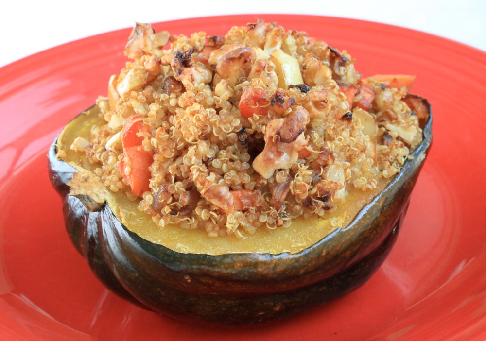 The first Fall squash just arrived in my CSA veggie box — rich flavored, delicious acorn squash. Yeah! Each season has its culinary stars, and squash are definitely the stars of Fall. Another autumnal joy is the new crop of apples in my local market. I combined sweet-tart apples with protein packed quinoa and walnuts for the stuffing for acorn squash. This tasty main dish is vegan, gluten free and packed with nutrition.