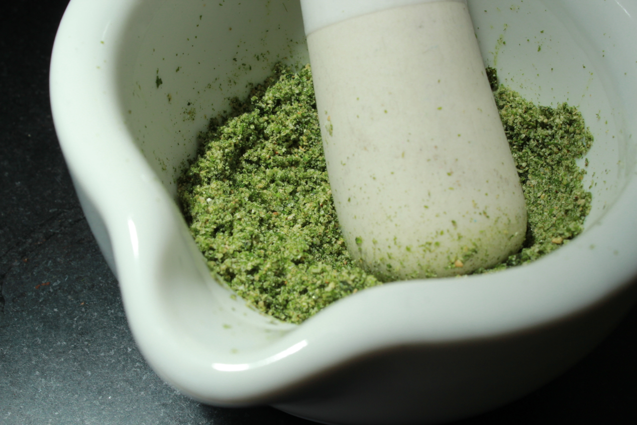 Grind furikake in a mortar and pestle until it breaks up and begins to get powdery.  Set aside.