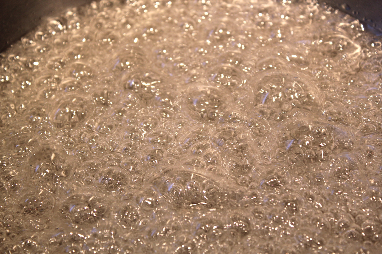 By this time the syrup should be boiling away. When the syrup comes to a full boil, boil on high for three minutes. (242 f). You should notice that the syrup is still clear, but seems thicker. Be careful — it’s super hot. It will look like this: