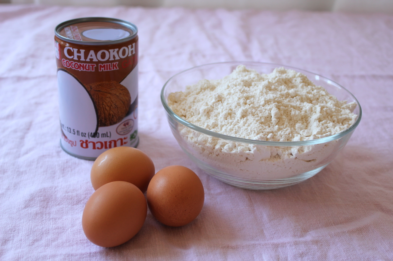 Place white cake mix, coconut milk, and three whole eggs into mixing bowl, then blend on low for 30 seconds. Scrape down sides of the bowl. Beat on medium speed for two minutes.