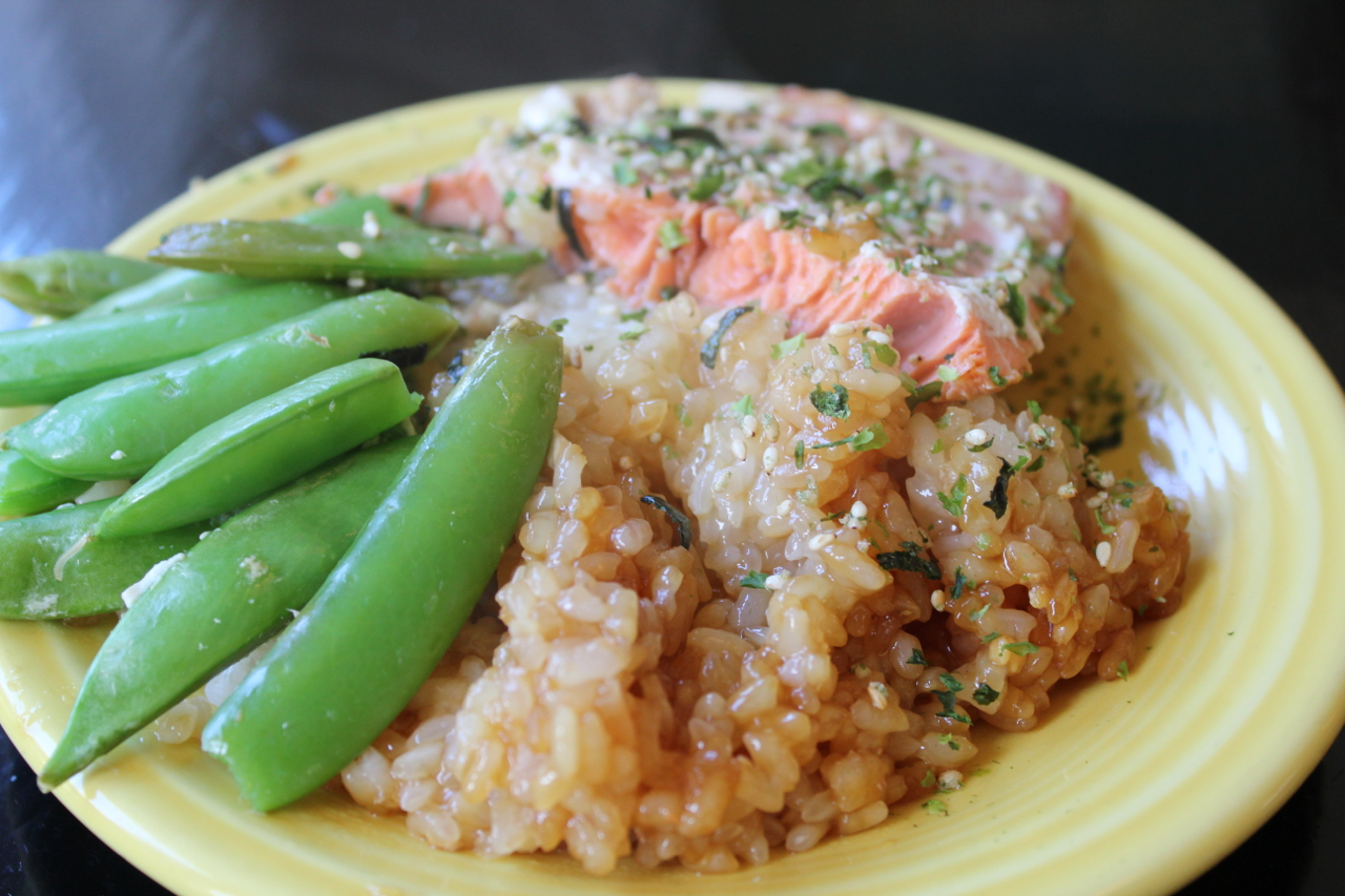 The basic concept is that you’re steaming salmon and snap peas on top of the rice, then adding a simple flavoring sauce toward the end. Enjoy!