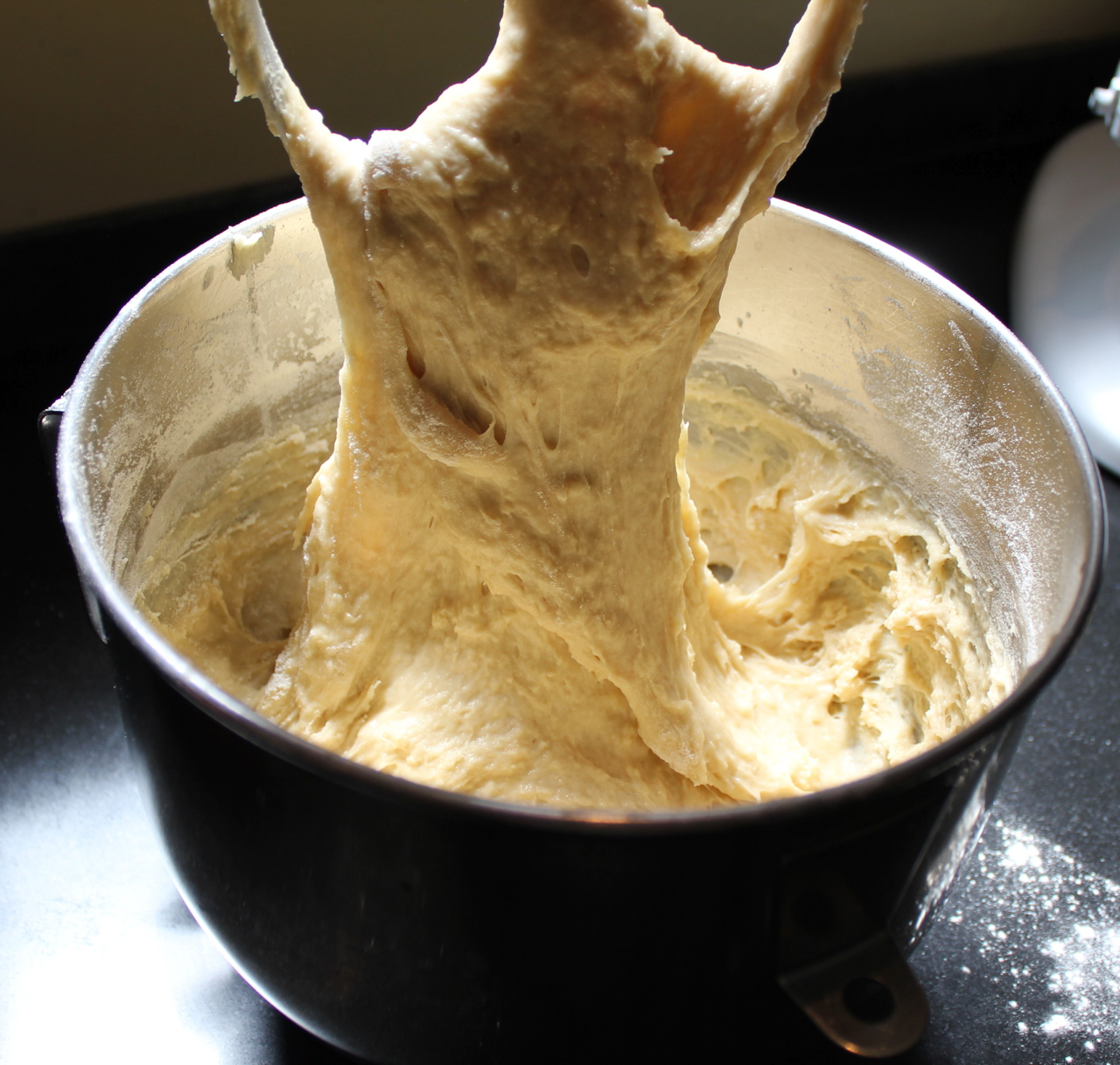 Put the butter pieces in the hot milk, stirring to melt the butter. Add 1/2 cup sugar, the salt and 2 eggs to the mixing bowl with milk and butter. Mix until combined. Then mix in about a cup of the flour and the yeast mixture. With mixer running on low power, add in more flour, about a cup at a time, until a the dough begins to be a thick, shiny batter. Continue to mix for a couple minutes. This is developing the structure of the dough. Here is what the dough will look like after beating to develop structure: