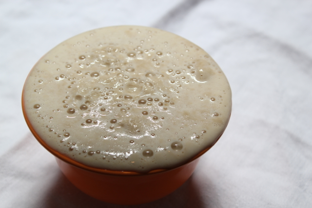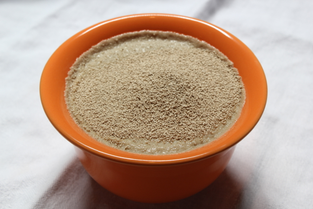 Next, mix dry yeast, 1 tsp. sugar, and hot water together in a bowl. This is to get the yeast active and growing. Below, you can see the yeast dry and after a couple minutes in the water sugar mixture: