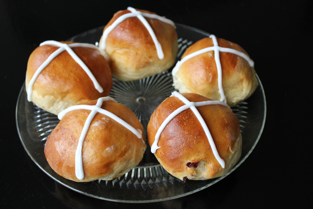 My take on these buns is the selection of spices and dried fruits — fresh orange zest, cardamom, and cinnamon perfume the dough while dried sweetened cranberries and currants bring bits of sweetness. All in all this is one tasty addition to breakfast or afternoon tea.