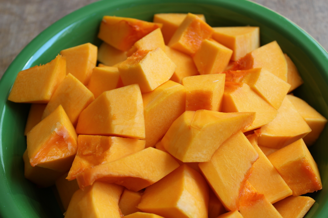 Peel the butternut squash, taking care to get past the thin pale layer that lay just beneath the skin. Split the squash, remove the seeds from the hollow cavity, and cut the squash roughly into 2″ chunks.