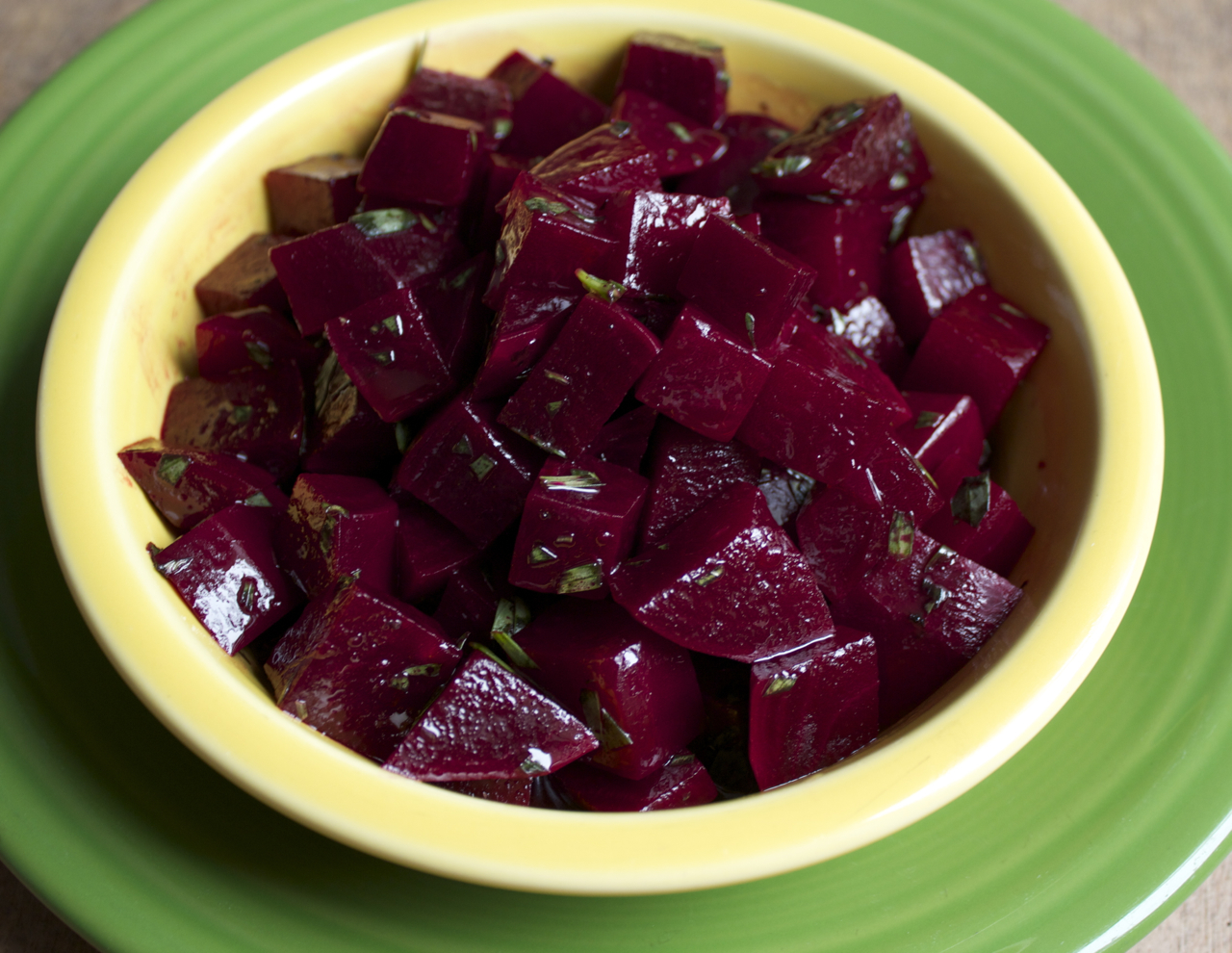 Peel and cube the beets.  Place in a covered sauce pan and add just 1/2 to 1 inch of water.  The water shouldn’t cover the beets, just keep them moist and steamy while cooking.  Place on high heat, covered.  Bring to a boil, then turn heat down and simmer for about 20 minutes, or until beets are just tender.  Drain liquid from beets, then cool beets to room temp.