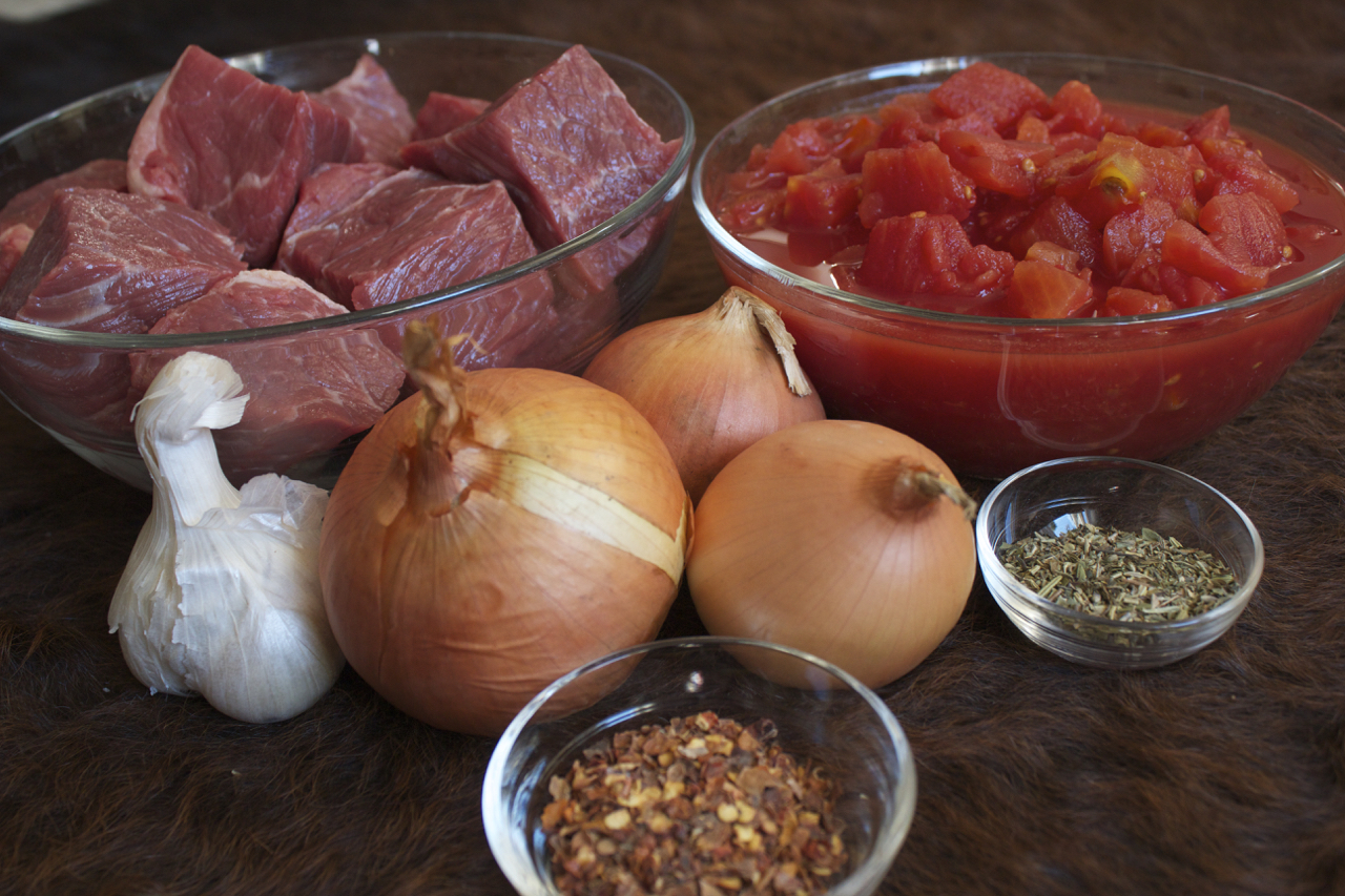 Heat a large covered pot on medium high until warm. Add beef chunks and allow to brown on one side before turning each. When two sides of chunks are browned, add onion and garlic and saute for a few more minutes. Add remaining ingredients and bring to a simmer. Then cover, and simmer on low for two hours, or until beef is tender but not falling apart. Taste for salt and adjust seasoning. Serve in shallow bowls over a serving of creamy polenta, or with crusty bread. Drizzle with your best quality extra virgin olive oil before serving for extra flavor.