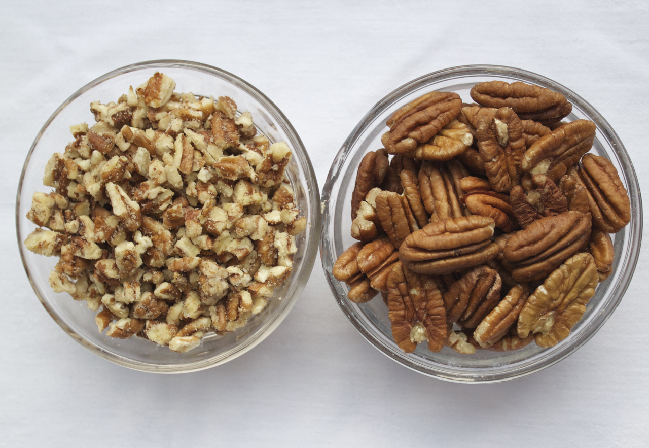 * It is ideal to chop the pecans by hand to achieve the most uniform results. That said, I often use my food processor to chop the pecans, but it does take finesse to make sure the pecans don’t turn into powder. If there are some courser pieces remaining, I just shake them to the top of the pile, scoop them off, and chop them by hand.