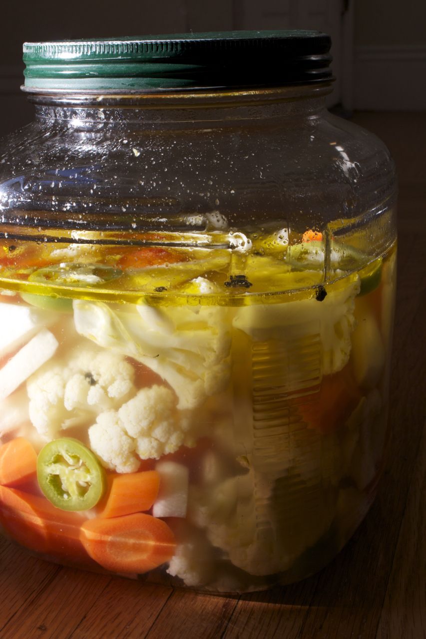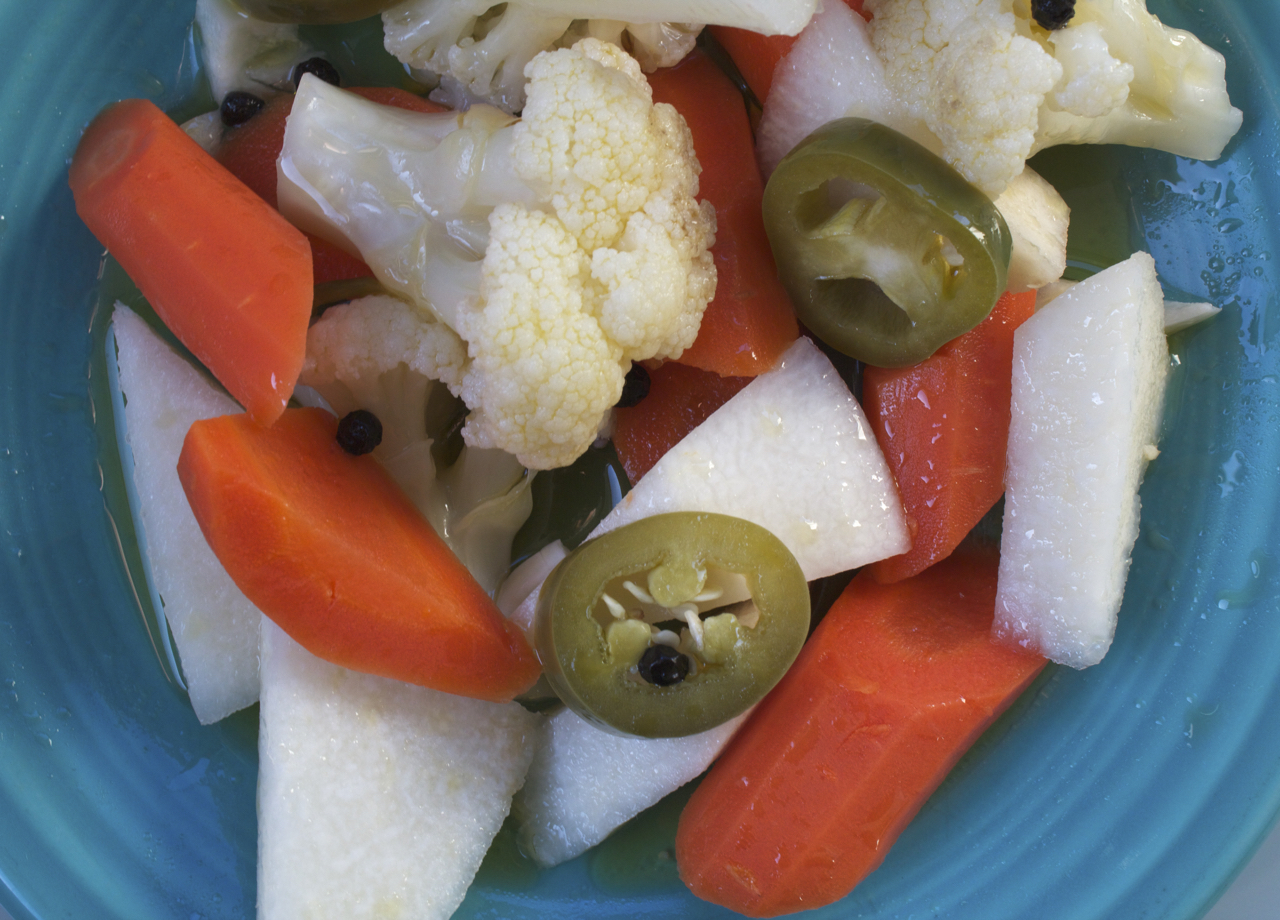 This is my version of a common side dish in local mexican restaurants: mildly spicy, toothsome vegetables in a balanced light brine. I make mine with carrots, cauliflower, jicama, and jalapenos.