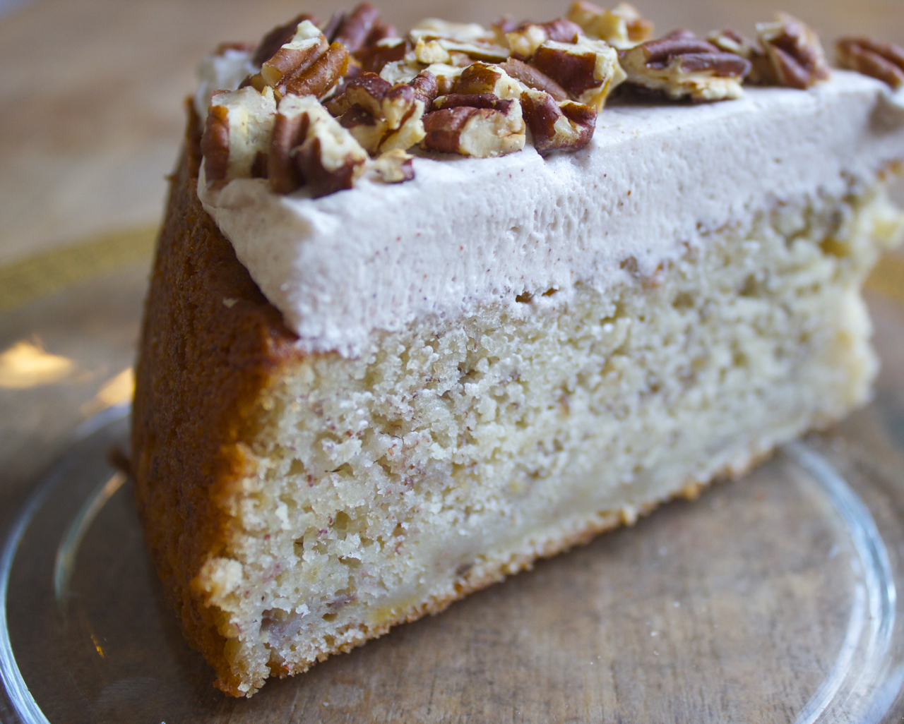 Banana Cake sliceThis buttermilk moistened banana cake is tender and sweet with warm notes from fragrant cinnamon and topped with crunchy toasted pecans.