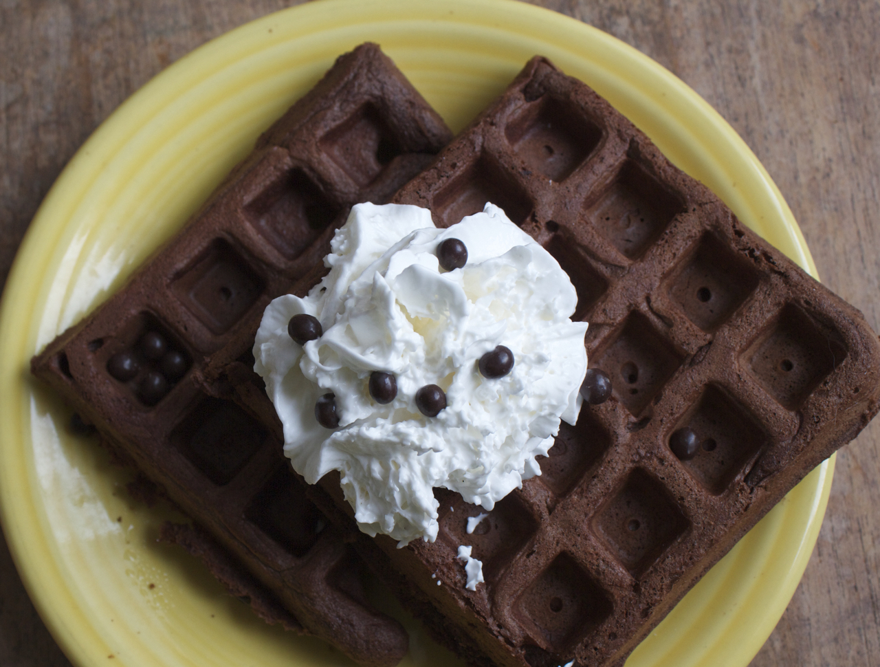Chocolate waffles hot from the iron with a fluffy cloud of whipped cream make for a perfect dessert.  Or — if it’s just one of those mornings — a rare breakfast treat.