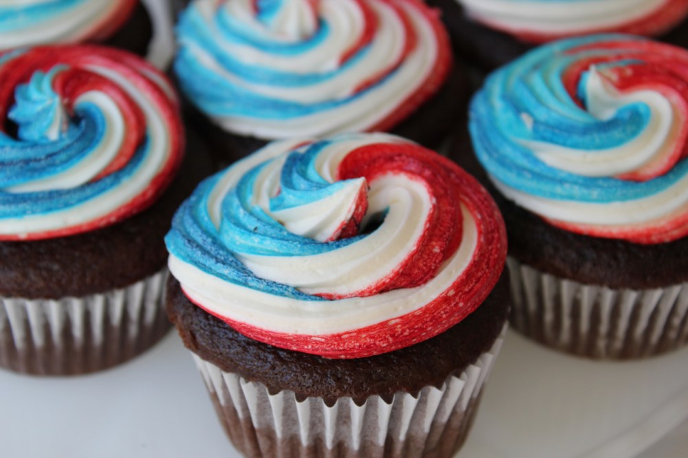 Note: to get the stripey red, white and blue frosting shown above, use a bamboo skewer to “paint” a stripe of gel food color inside your pastry bag. Start from the tip and go to about 1/2 way up the inside of the bag. I used red on one side and blue on the other side. Then fill the bag with frosting. When the frosting pipes out, it’s striped like above.