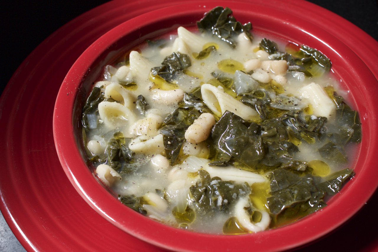Heat a large soup pot over medium heat. Add olive oil and onion. Sauté for a few minutes. Add the garlic, kale, water, beans, and about 2 tsp. salt. Bring to a simmer, and cook – covered – for about 45 minutes. Add the dry pasta, then simmer for another 15 minutes or until tender. Add some pepper to taste, then adjust salt to taste. Ladle into bowls and drizzle with your best extra virgin olive oil.