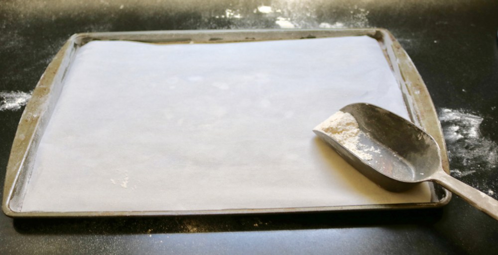 Preheat over to 375. Grease and flour the sides of a 15″ jelly pan roll, then fit a sheet of parchment paper, also greased and floured, to the bottom of the pan.
