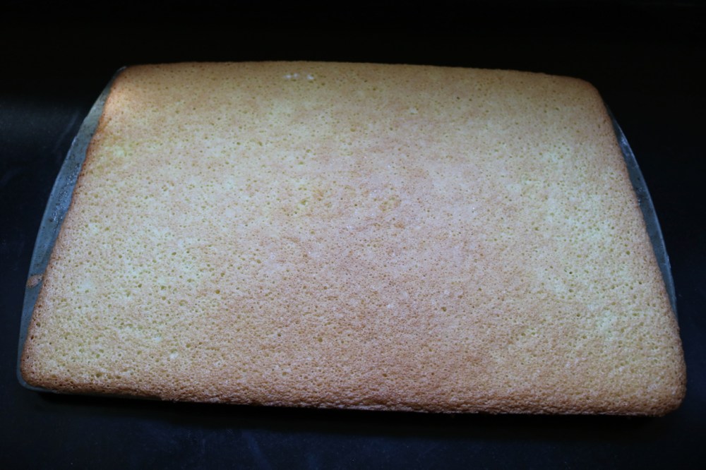 The spongecake is simple and fluffy, and rolls up nicely without cracking. For this cake you’ll need a 15 inch jellyroll pan and parchment paper.