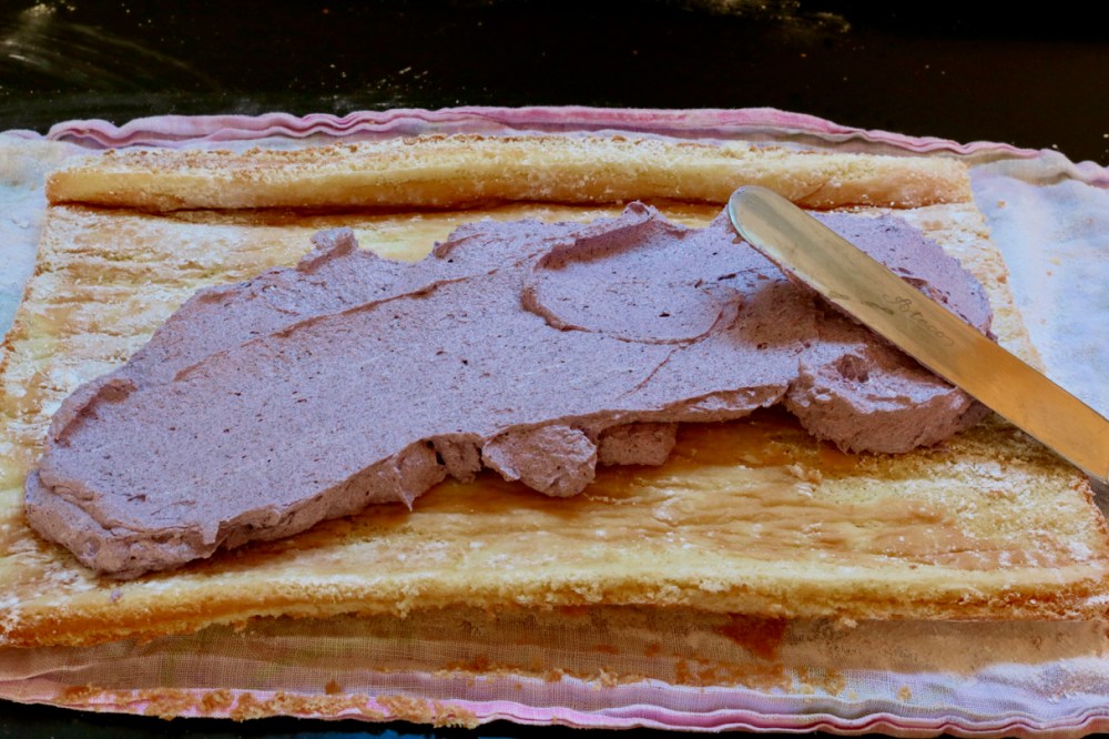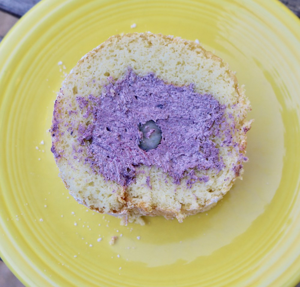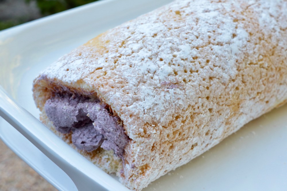 Blueberries are one of my favorite fruits. I have several new Southern high bush blueberry plants in my garden this year. Their flavor is rich and sweet — but subtle in a dessert. To get the blueberry flavor and color I was after, I turned to freeze dried blueberries to add big blueberry flavor to this luscious spongecake roll. Adding whole fresh blueberries adds texture and interest to this treat.