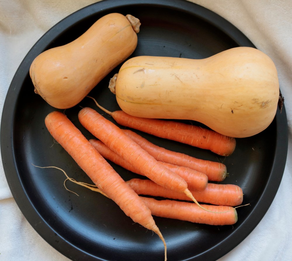 Full Belly’s carrots are divine — tender, crisp, sweet Nantes carrots. Just toss them unwashed into a bag and they’ll stay happily fresh for weeks, though they usually get eaten up before then because they’re so delicious. Great as a quick mid day snack as is, or perhaps I’ll make Carrot Coconut Soup for dinner one night. The butternut squash will store for a long while. Maybe this week I’ll make Butternut Squash Steaks.