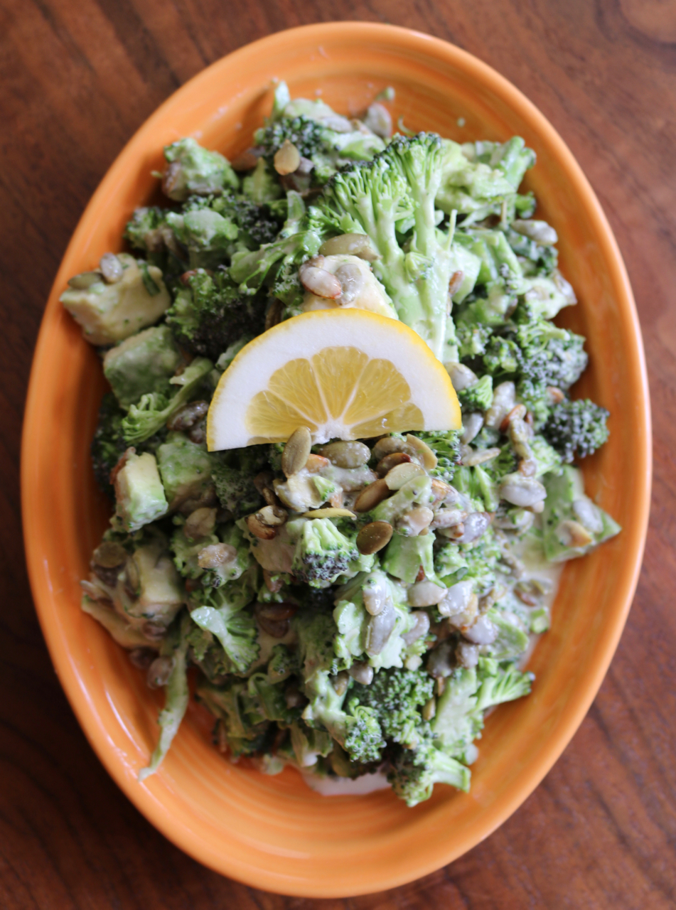 I love this salad — raw broccoli, creamy avocado, and crunchy pepitas brought together with a tangy lemon and tahini dressing.