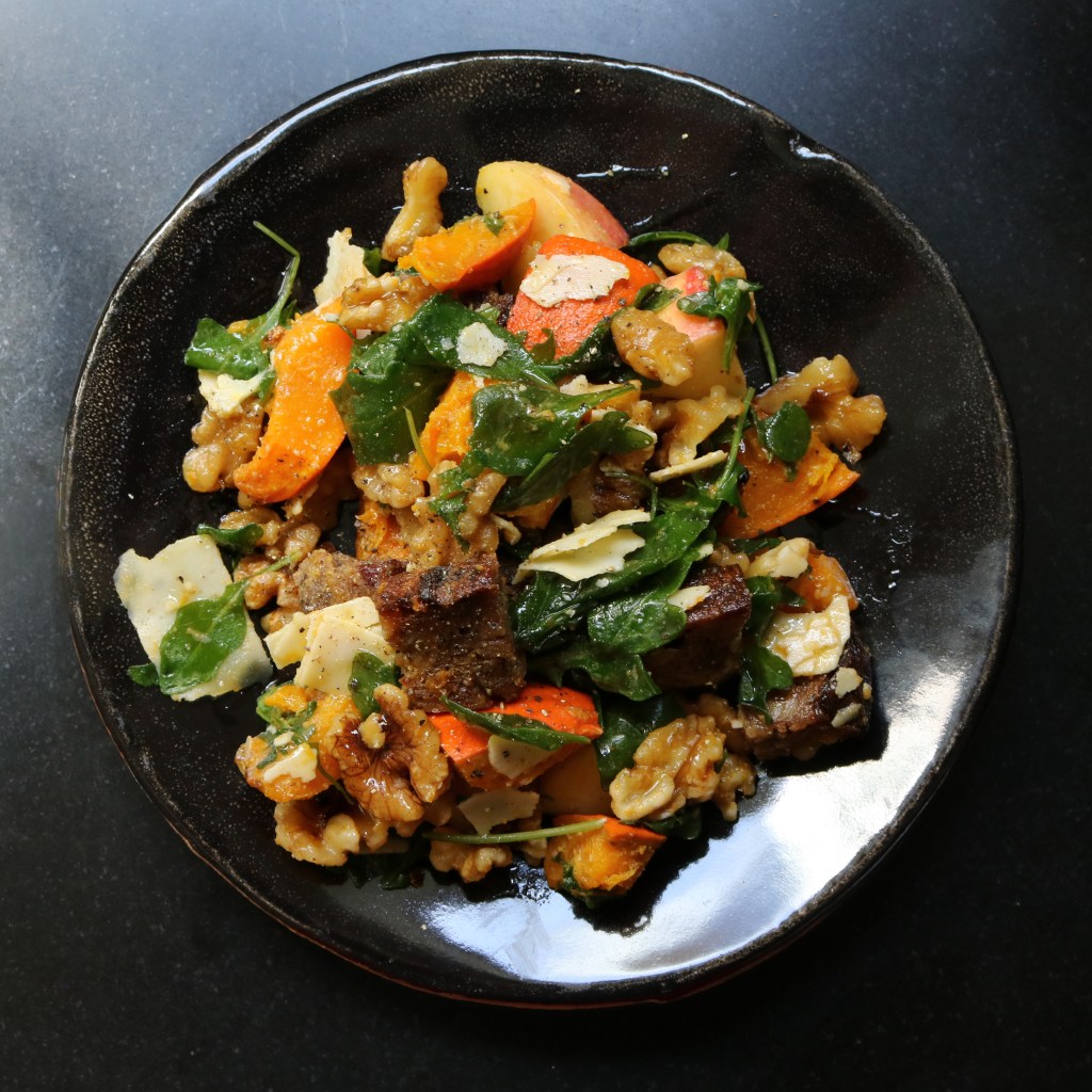 Think of this recipe as a template rather than a detailed list, as many of the components can be switched out for what’s ripe and ready to enjoy in your gardens and markets. I used Kuri squash in this recipe, but you could substitute Butternut or any other smooth fleshed winter squash. I threw in some walnut halves, but you could substitute any nut of your choosing. I had some leftover Acme Cranberry Walnut Levain (fancy!) but you could use the hearty bread of your choosing. I chose an aged sherry vinegar for this recipe, but you can use the vinegar of your choosing. You get the drift! The key is to balance the flavors and textures in your dish: savory, sweet, creamy, crunchy, rich, bright. Strive to keep the flavors working togther. Enjoy!