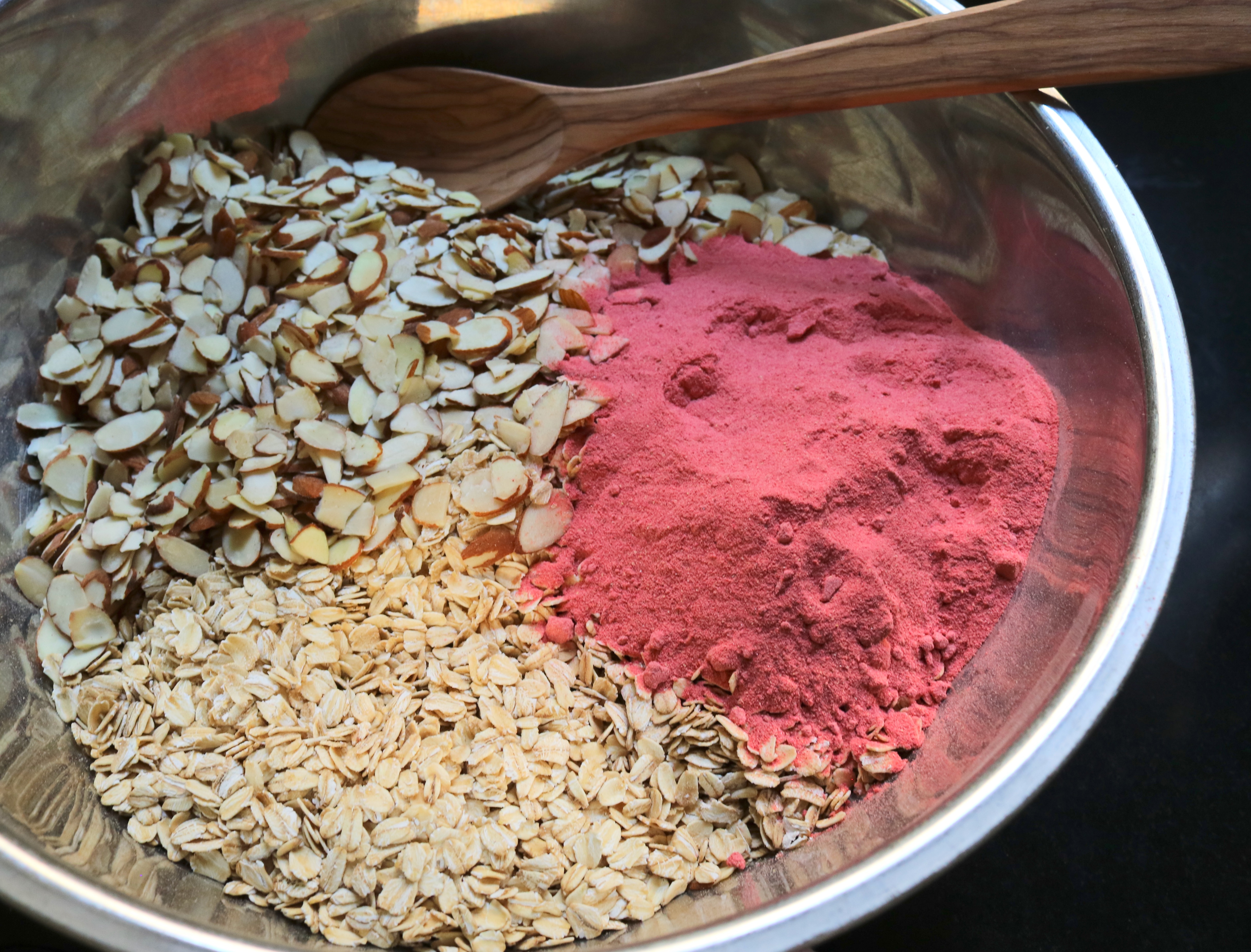 Using powdered freeze dried strawberries in the granola mixture allows for a rich strawberry flavor, accented by the sweet note of vanilla. Together they taste like strawberries and cream — even with no cream in sight! (Though, for a special treat try it with actual cream. Fabulous!)