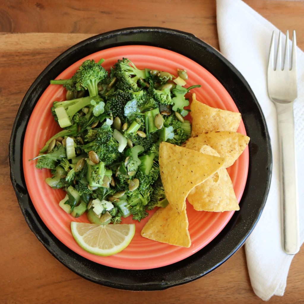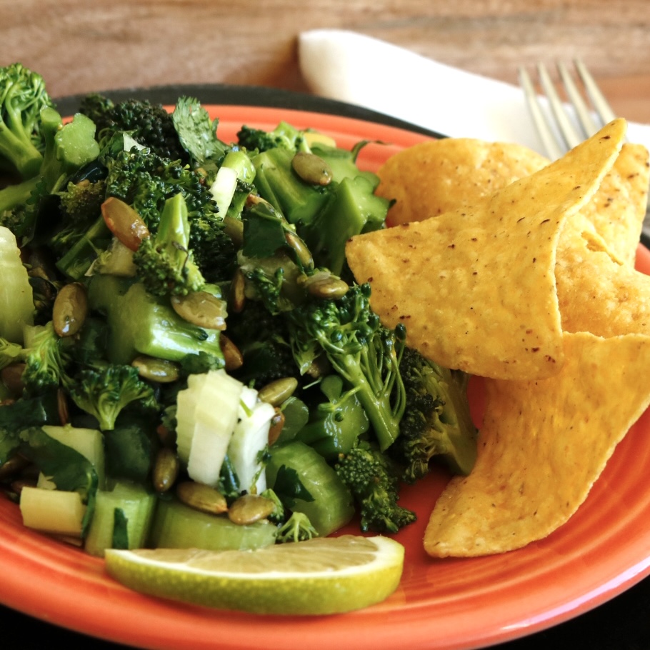 My Persian lime tree is loaded with ripe fruit, begging to be used in tangy, bright culinary creations. This recipe starts with fresh broccoli, adding celery for savory crunch and pepitas for richness. The simple dressing uses fresh squeezed lime juice and minced salt preserved limes for punch. Add a few tortilla chips and you’ve got lunch. This salad will be delicious for several days after making, storing easily in the fridge. Enjoy!